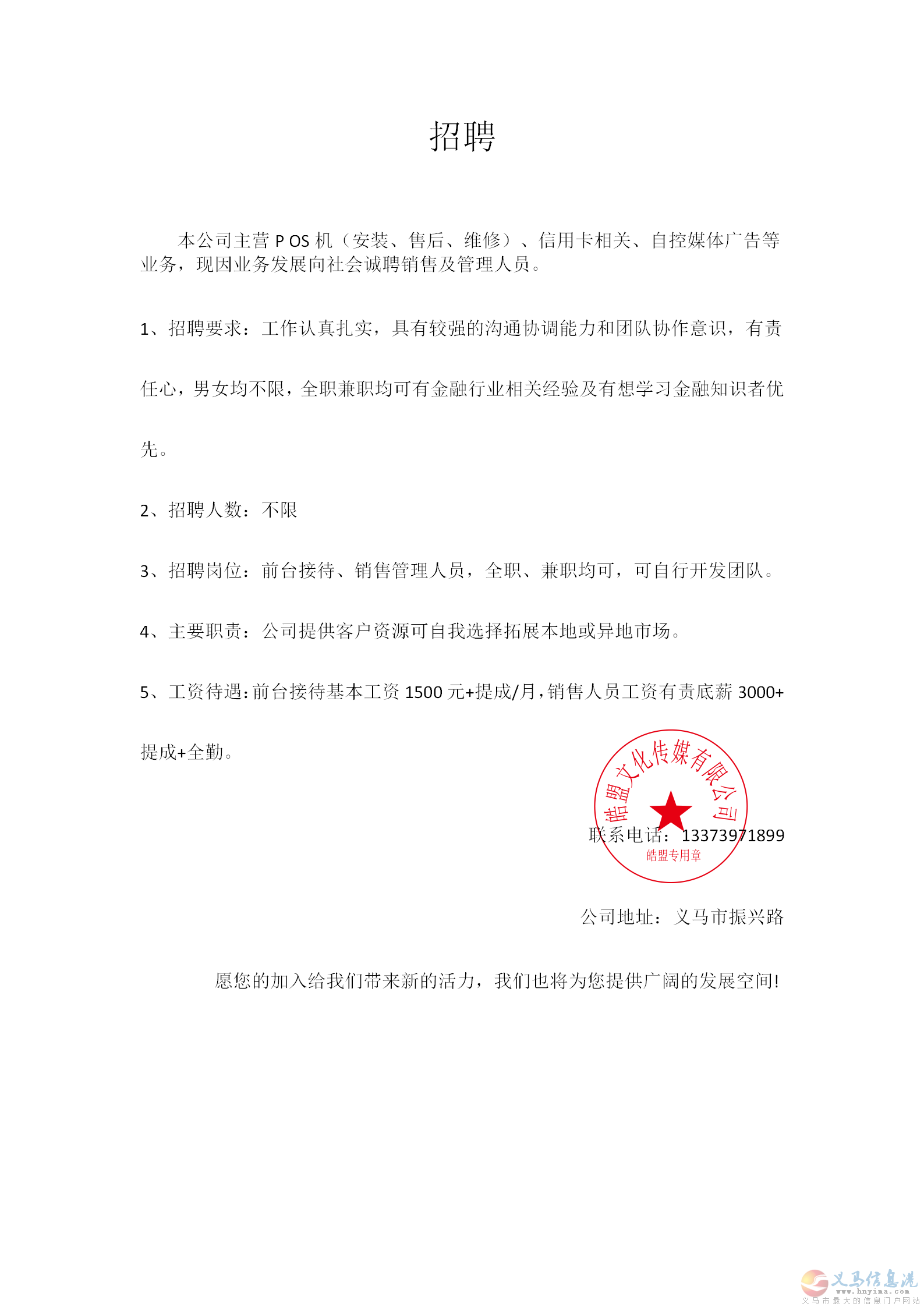 本公司主營POS機、美團智能支付、穿戴式自創(chuàng)廣告衣等相關(guān)金融業(yè)務(wù),現(xiàn)面向義馬、澠池地區(qū)招聘業(yè)務(wù)經(jīng)理、代理商,有相關(guān)經(jīng)驗或?qū)χЦ缎袠I(yè)有意向者優(yōu)先